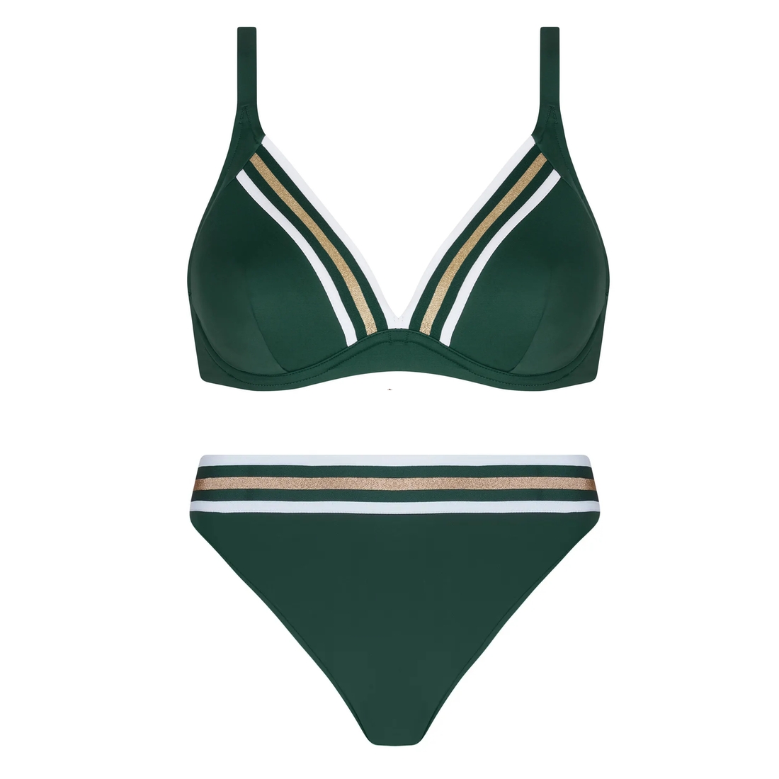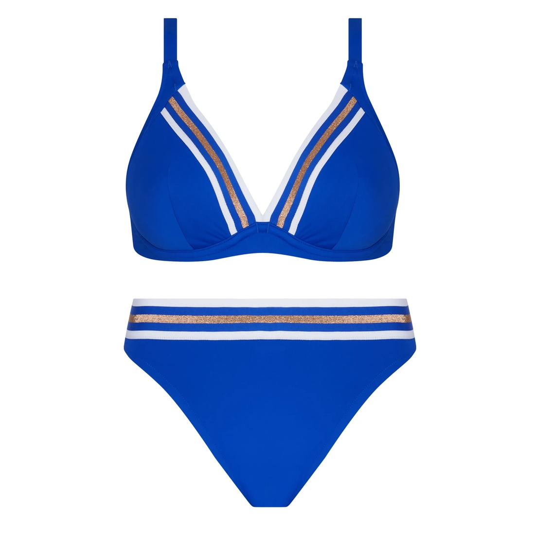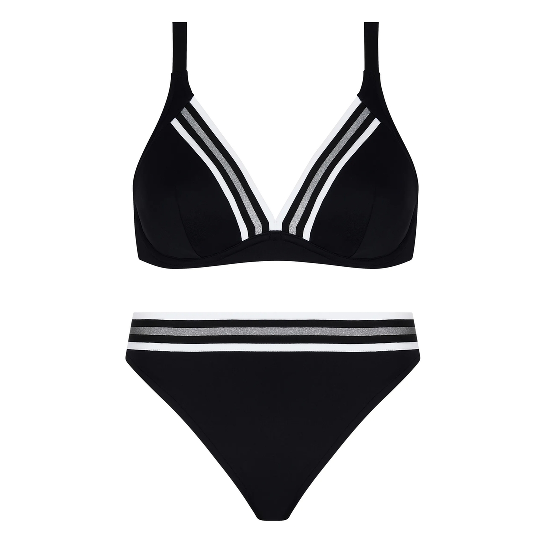 Les larges bandes élastiques en tour de dos et sur le haut des bonnets, rehaussées d’un fil lurex scintillant, apportent une touche sporty et graphique au modèle.